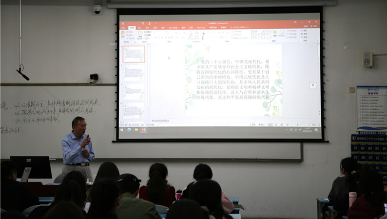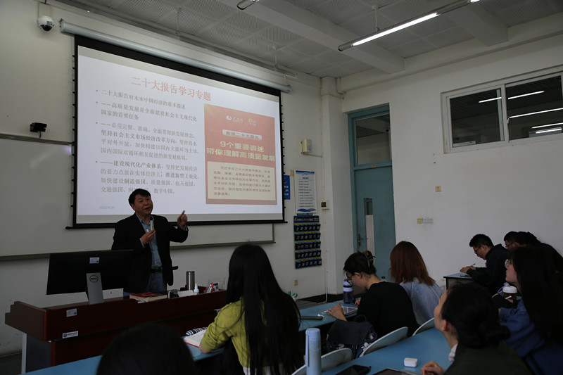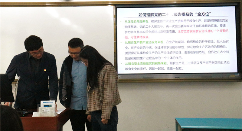 在第二阶段的教学观摩活动中,公司组织新进教师来到示范课堂,现场感受进课堂进头脑的浓厚氛围,积极交流、分享经验。《生态文明与经济发展方式研究》课程主讲教师苗壮在讲授“中国的耕地资源与粮食安全”内容时,强调党的二十大报告明确提出“全方位夯实粮食安全根基,牢牢守住十八亿亩耕地红线,确保中国人的饭碗牢牢端在自己手中”,从三个视角对“全方位”这一概念进行解读和阐释,并从理论角度分析了今年中央一号文件提及的“大食物观”。《中级宏观经济学》主讲教师刘书祥带领同学们专题学习党的二十大报告对未来中国经济的基本描述、关于高质量发展的9个重要表述等内容,结合课程实际切实提升员工的理论认识。《习近平经济思想专题研究》主讲教师蒋南平采用专题式教学,着重分析和解读党的二十大报告中关于“中国式现代化”的阐述,从历史和理论维度讲解“中国式现代化”的中国特色和本质要求。
