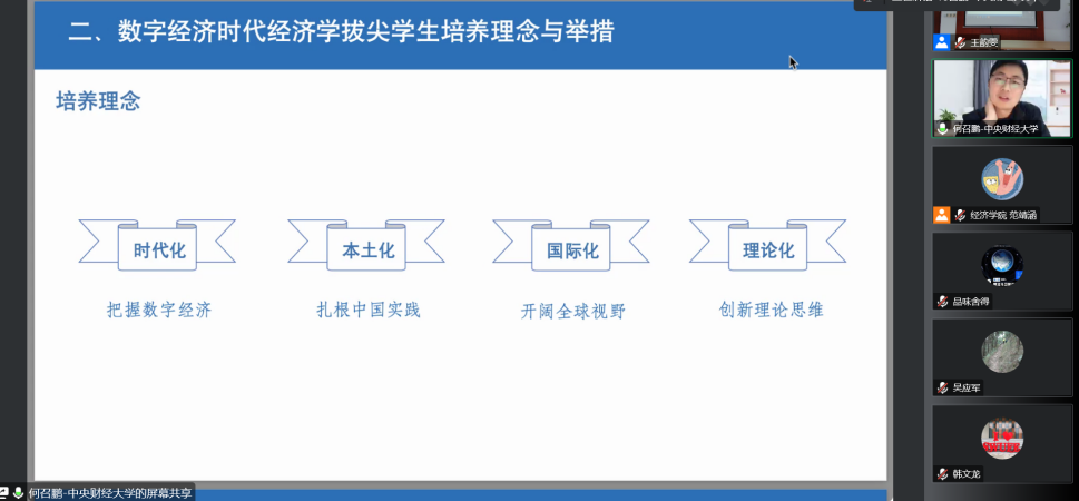 最后,何召鹏教授结合培养方案介绍了中央财经大学经济学拔尖人才培养的课程体系建设,并就如何提高员工专业知识水平及学术能力发表见解。何教授指出:数字经济拔尖人才的培养是面向世界的,其培养模式和课程体系建设依然需要探索完善。