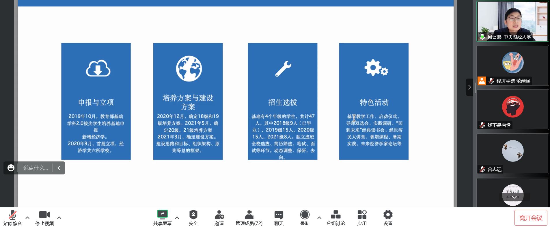 何召鹏教授首先阐述了数字经济时代背景、建设经济学拔尖人才培养的必要性、建设目标、组织架构等方面。接着详细从申报立项、培养与建设方案、招生选拔、特色活动四个方面介绍了中央财经大学经济学拔尖人才基地的建设情况。