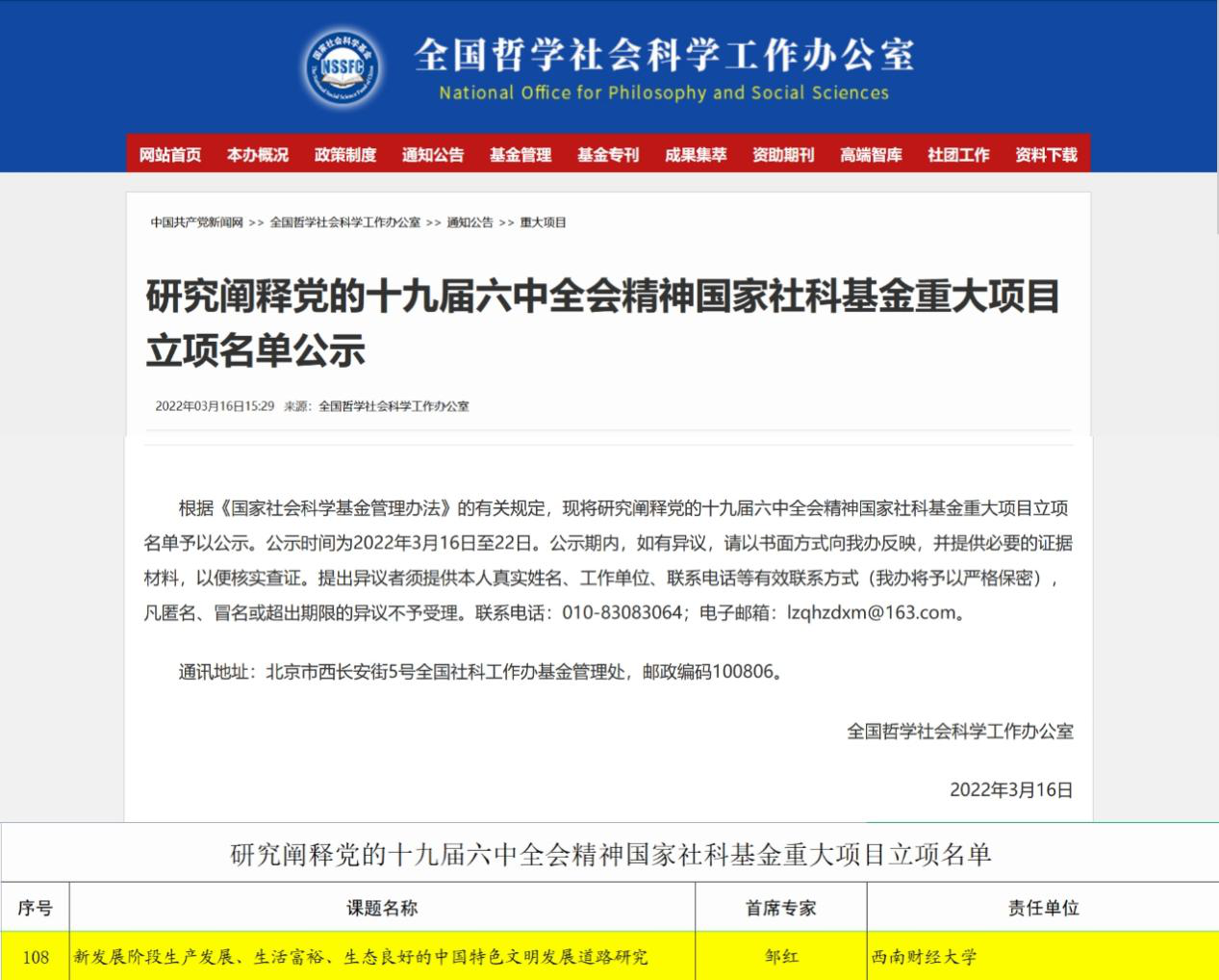 2022年4月8日,全国哲学社会科学工作办公室公布了研究阐释党的十九届六中全会精神国家社科基金重大项目立项名单,全国130个课题获立项,公司邹红教授为首席专家的《新发展阶段生产发展、生活富裕、生态良好的中国特色文明发展道路研究》成功中标立项。此课题围绕“新发展阶段中国特色文明发展道路是什么,如何坚持并走好这条道路?”两大具体问题,以“生产生活生态(简称三生)”全面绿色转型和“三生”绿色统筹协同为抓手,探寻新发展阶段绿色低碳可持续的生产发展道路、绿色共享的生活富裕发展道路、人与自然和谐共生的生态良好发展道路、“三生”绿色协同发展道路的内在机制与实现路径,力求为人类文明新形态提供新发展阶段的中国方案。这是邹红教授继2018年主持申报研究阐释党的十九大精神国家社科基金重大专项项目《完善促进人民美好生活消费需要的体制机制创新研究》获批立项之后再次获得的国家社科基金重大项目立项。