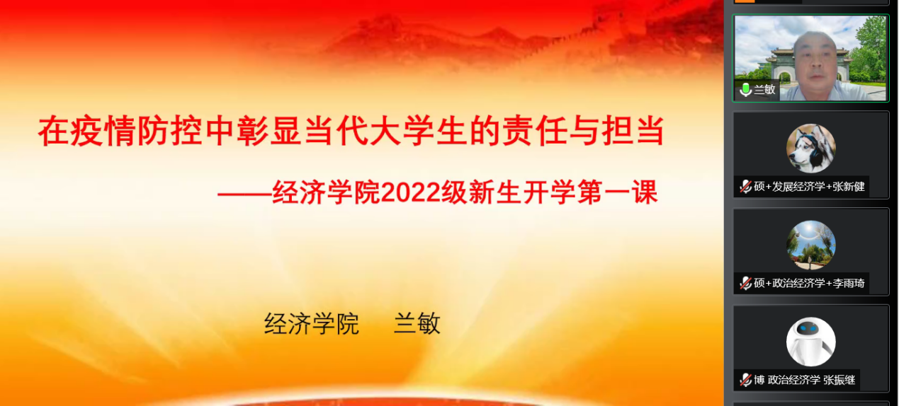 疫情防控是“国之大者”,同心抗疫是我们共同的责任。为深入贯彻习近平总书记关于“大思政课”的重要指示精神,落实立德树人根本任务,突出“思政大课”培根铸魂的重要作用,9月5日晚上,Mksport体育党委书记兰敏以《在疫情防控中彰显当代老员工的责任与担当》为主题,给学院2022级本科、硕士和博士新生讲授了一堂生动的思政大课。Mksport体育全体新生参加了此次学习。