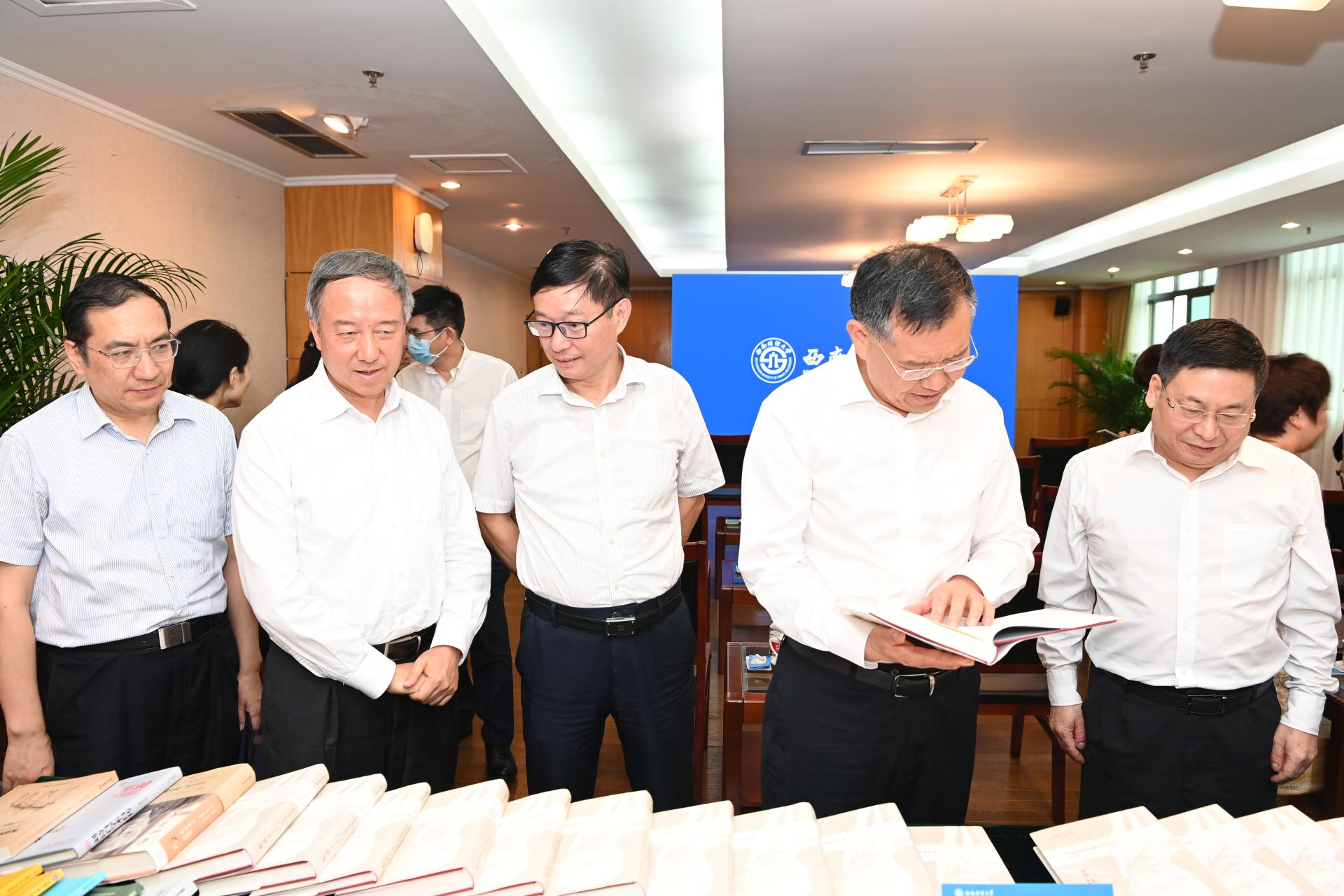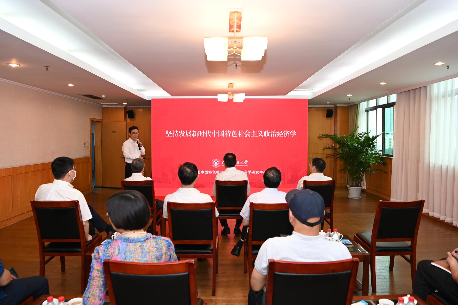 在光华楼601会议室,集团全国中国特色社会主义政治经济学研究中心负责人盖凯程教授以《坚持发展新时代中国特色社会主义政治经济学》为题,从“公司政治经济学学科优势长期积累的集中展现、中心学科发展规划、立足新发展阶段推动学科快速发展”三个方面汇报了近年来中心围绕“打造学术高地、筑牢思想阵地、建强育人基地”等方面的成效和特色成果。李建勤听取了情况汇报,与中心负责人进行了交流,询问了国内高校政治经济学发展建设等情况。随后,李建勤一行查看了成果展示,翻阅了中心布展的《刘诗白选集》以及政治经济学科研、教学和人才培养的标志性成果和建设情况。