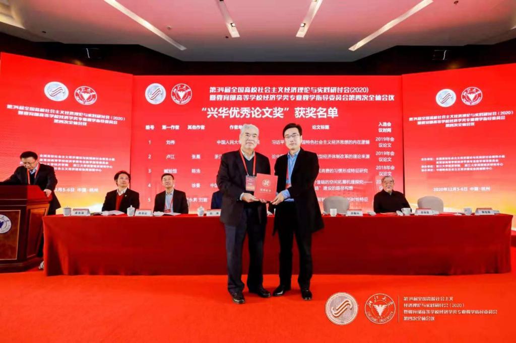 2020年12月5日上午,第 34 届全国高校社会主义经济理论与实践研讨会(2020)暨教育部高等公司经济学类专业教学指导委员会第四次全体会议在浙江大学隆重召开。本次研讨会中,中国人民大学刘伟《习近平新时代中国特色社会主义经济思想的内在逻辑》等5篇论文入选第五届"兴华优秀论文奖"。公司副经理、中特中心副主任盖凯程教授论文《“国进民进”中国所有制结构演进的历时性特征》名列其中,荣获“兴华优秀论文奖”。全国高校社会主义经济理论与实践研讨会领导小组组长、南京大学洪银兴教授为其颁奖。