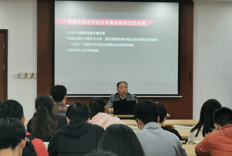 易敏利结合发展经济学的学术视角,从学习领会十九届五中全会精神关于未来五年经济发展的重要论述、认真研究新时期中国特色社会主义强国建设的发展战略模式、中国的发展模式与中国特色的社会制度治理体系等三个方面展开讲授,通过丰富的案例、深入浅出的语言,以“十四五”规划和2035年经济发展目标切入,阐释了新中国经济快速发展和社会长期稳定“两大奇迹”与中国特色社会主义制度国家治理体系的内在联系,带领同学们一同展望了在中国共产党的坚强领导下中国特色社会主义现代化强国建设的新征程。