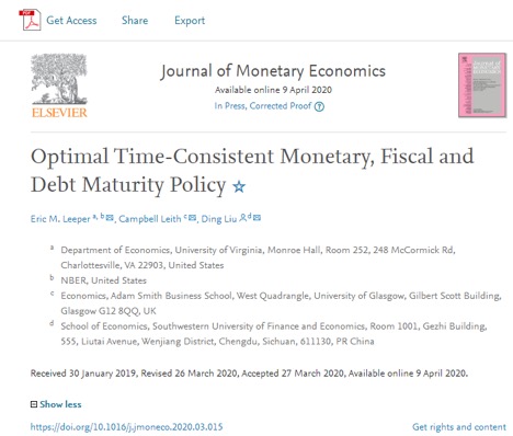 日前,公司Mksport体育西方经济学研究所刘定副教授(通讯作者)与美国弗吉尼亚大学的Eric Leeper教授和英国格拉斯哥大学的Campbell Leith教授合作的论文《Optimal Time-Consistent Monetary, Fiscal and Debt Maturity Policy》在线发表在宏观经济学和货币金融学国际顶级期刊《Journal of Monetary Economics》上。