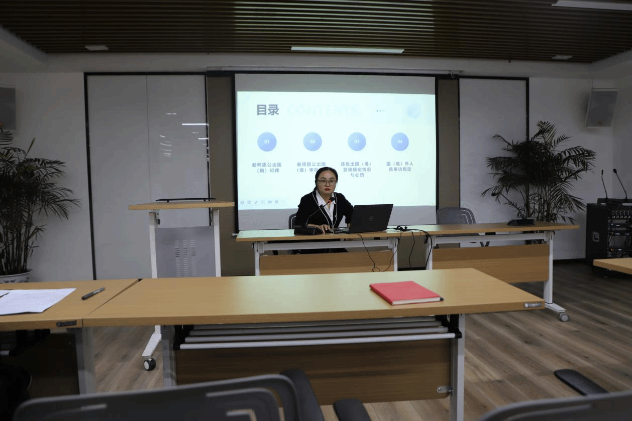 随后,邹红副经理带领全院教师共同学习了教师因公出国(境)纪律、教师因公出国(境)审批流程、违反出国(境)管理规定情况与处罚、国(境)外人员来访规定等外事相关事项。