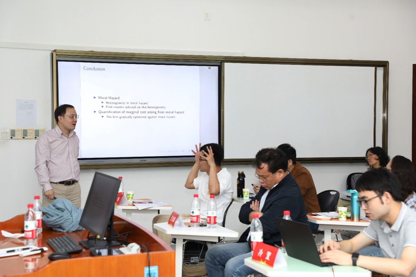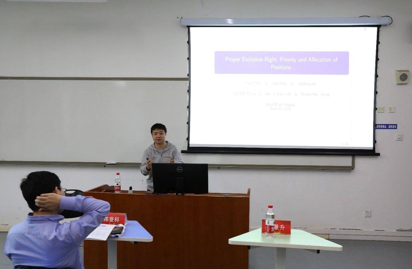来自武汉大学的余景升老师汇报了题为《Proper Exclusion right, priority and allocation of positions》的论文。该文章探讨了对具有排他权性质的物品、工位等“资源”的分配原则与使用规则。如何在没有产权的基础上,设计这些具备排他权的物品(一般由优先权带来)使用问题?如何在一定假设(规范)基础上,达到一个竞争性均衡?文章通过构建模型,推导得出“弱公平”等一系列结果,从而达到对具有“排他权”物品的权力安排。