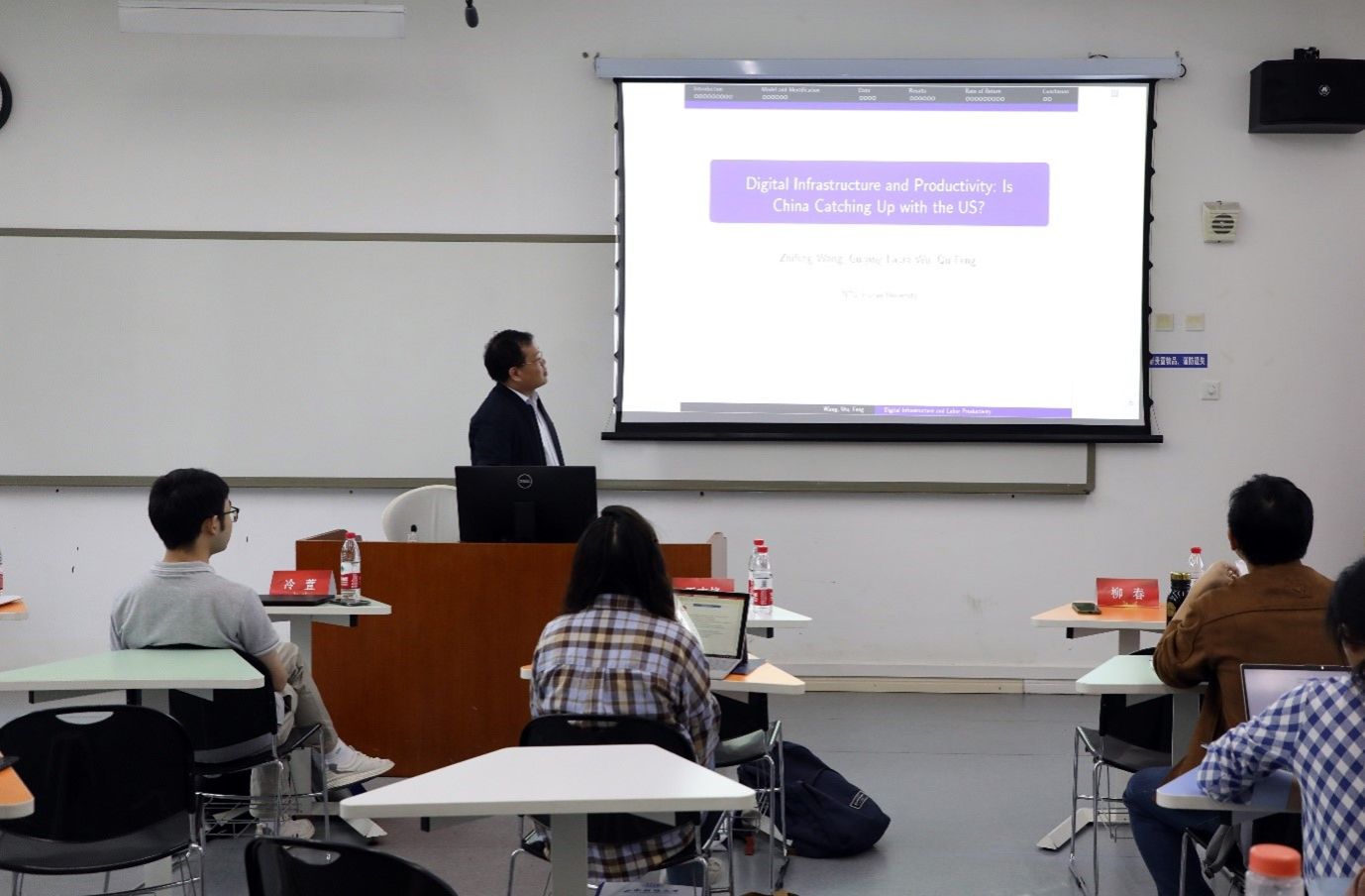 来自湖南大学的王志锋老师汇报了题为《Digital infrastructure and productivity: Is China catching up with the US?》的论文。该研究利用了2013年至2019年间中国和美国的国民经济核算数据,以评估数字基础设施对生产力的影响。发现中国的数字基础设施对生产力产生了显著且正向的效应。此外,通过对比美国和中国的经验数据,发现两国在数字基础设施投资占GDP比重和数字技术采用程度上存在显著差异,两国的数字技术却呈现出相似的生产力效果和社会回报率。
