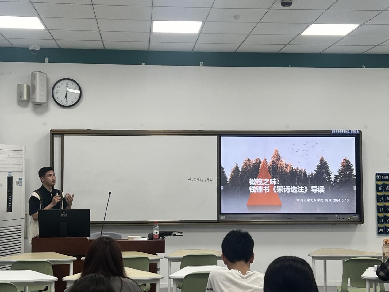 5月10日下午,光华讲坛6513期——“《宋诗选注》导读”学术讲座在经世楼203教室成功召开。本次讲座由四川大学陶熠副研究员主讲,对《宋诗选注》进行了深入的探讨,丰富了参会师生的文学素养。公司姚常成副教授主持了本次讲座。