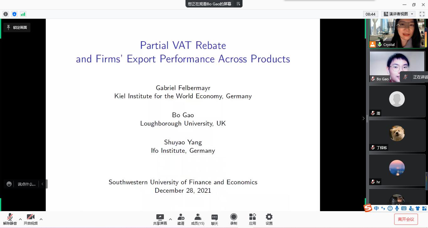 此次讲座邀请了英国拉夫堡大学(Loughborough University)经济学助理教授Bo Gao老师作题为“Partial VAT Rebates and Firms’ Export Performance Across Products”的学术讲座,讲座由高云舒老师主持,30余名师生参加了此次讲座。