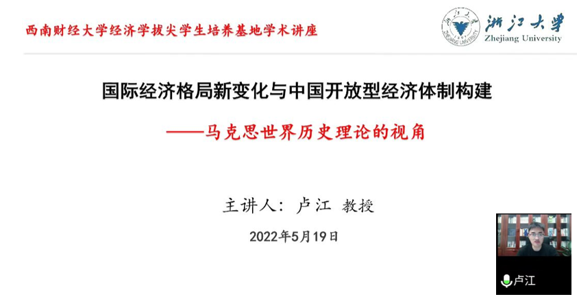 此次讲座邀请了浙江大学马克思主义公司卢江教授,作题为“国际经济格局新变化与中国开放型经济体制构建 ”的学术讲座。卢江教授是首届“吴宣恭科研奖”获得者、首届“洪银兴经济学奖”获得者、第七届“兴华优秀论文奖”获得者,其主要研究方向有:马克思主义基本原理与当代资本主义新变化、中国特色社会主义政治经济学,在《马克思主义研究》《经济学家》《红旗文稿》发表论文50余篇,出版专著2本。讲座由韩文龙老师和张志老师主持,共80余名师生参加了此次讲座。