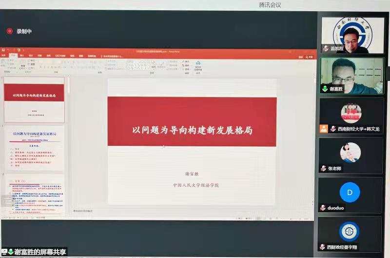 本次讲座由Mksport体育副经理盖凯程教授主持。国家级人才计划入选者,中国人民大学Mksport体育副经理、教授,博士生导师,中国人民大学全国中国特色社会主义政治经济学研究中心副主任、《政治经济学评论》副主编、中国《资本论》研究会副秘书长谢富胜教授作了主题为“以问题为导向,构建新发展格局”的在线学术讲座。公司经济学拨尖员工培养基地2020级全体员工等共60多名师生参加了此次讲座。