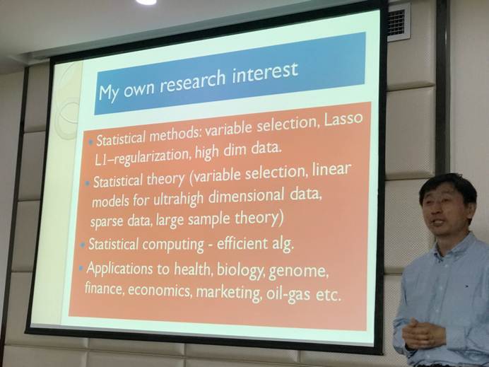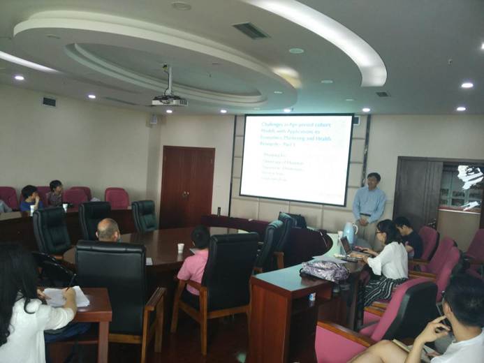 2018年5月7日下午,Mksport体育学术创新系列讲座第29期在格致楼918会议室成功举行。此次讲座邀请休斯顿大学数学系Wenjiang Fu教授作了题为“ Challenges in Age-Period-Cohort Models and Applications to Economics, Marketing and Health Research”的学术报告。讲座由徐舒教授主持,公司董朝华教授、刘定副教授、田超岳副教授和部分员工参与了此次讲座。